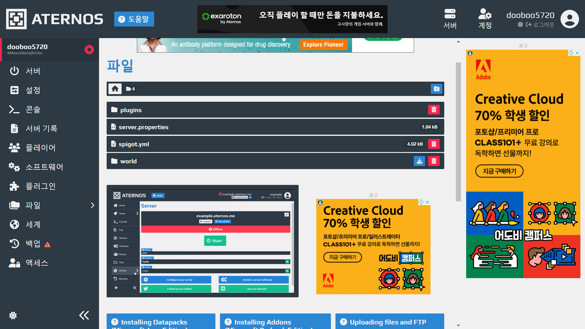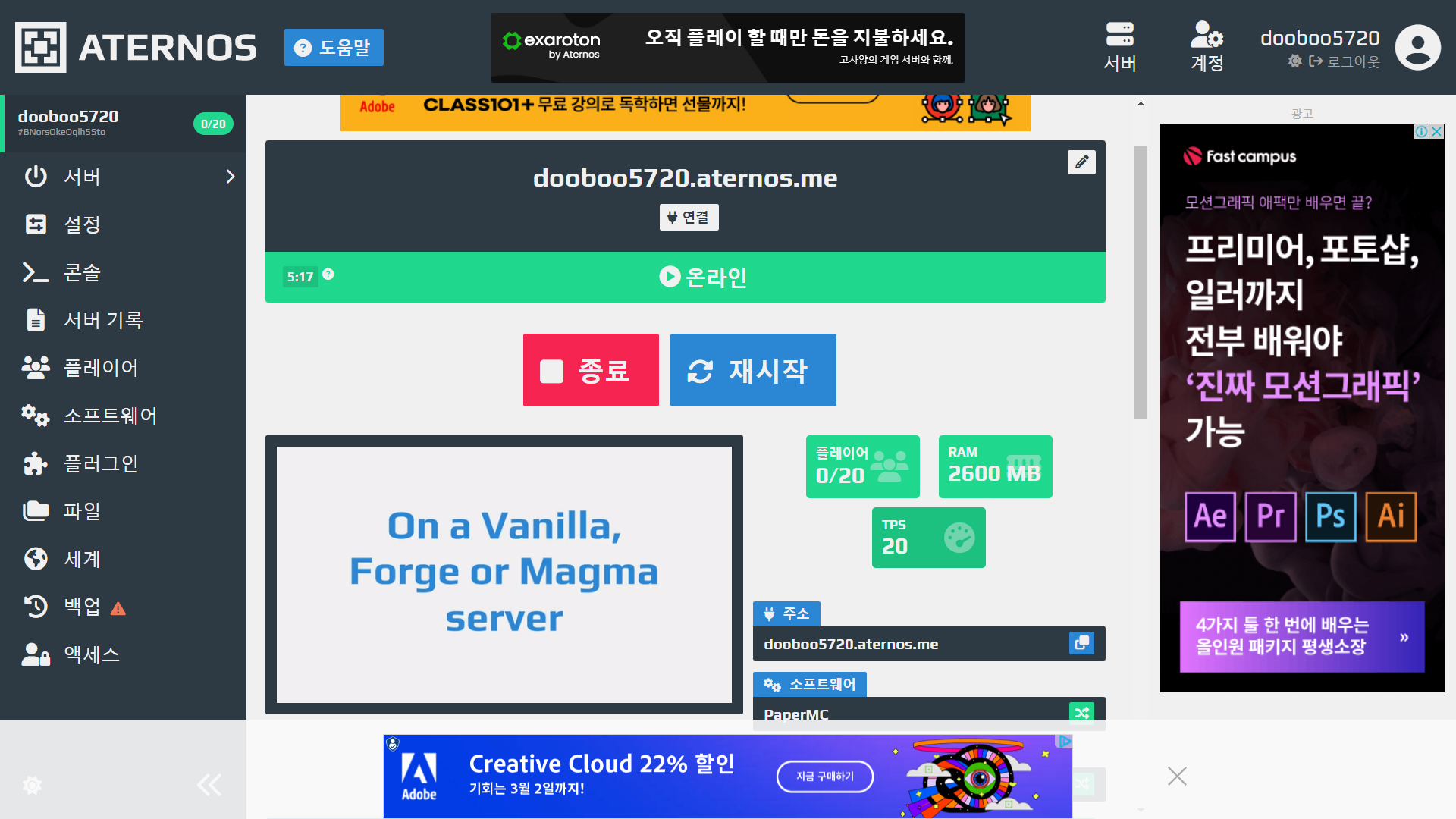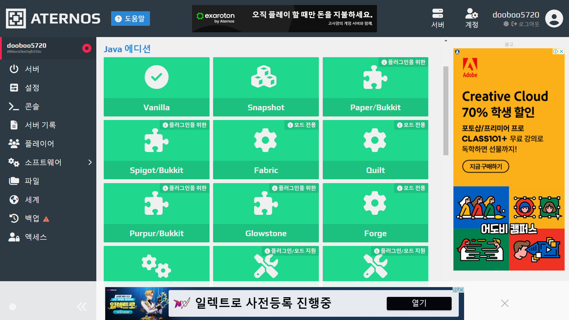 서버 호스팅 사이트 aternos를 이용하여 서버열기