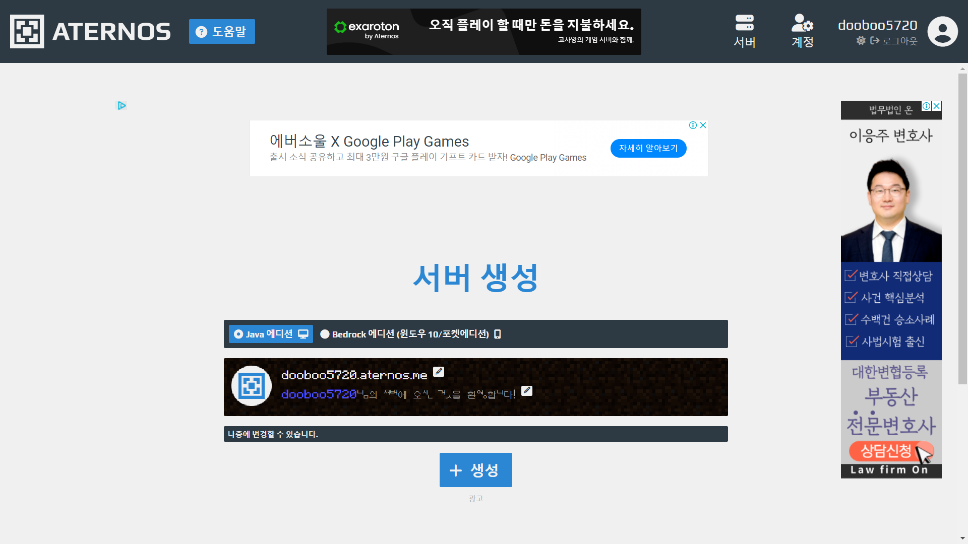 로그인후 서버생성을 눌러서 기본 서버 설정을 시작합니다. 자바와 베드락중 선택후 서버이름 서버 주소 MOTD를 설정해줍니다. 여기서 MOTD는 아래 서버를 설명하는 글로 서버 아래 나오는 글자를 말합니다. 그후 생성을 눌르면 서버가 바로 생성됩니다.
