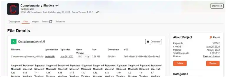 Complementary Shaders인데 주소는 https://www.curseforge.com/minecraft/customization/complementary-shaders/files/3951170 입니다. 공식 사이트로 이동한 후 Download 버튼을 클릭해 다운로드 받을 수 있습니다. 버전을 마추시지 않으면 오류 100%로 발생합니다. 아래 지원 버전 잘 보시고 다운로드 받아주세요.